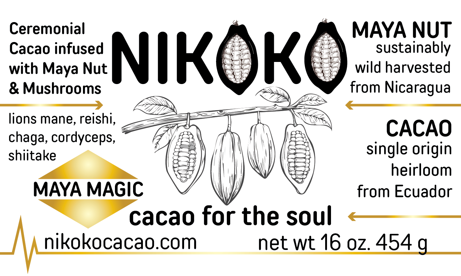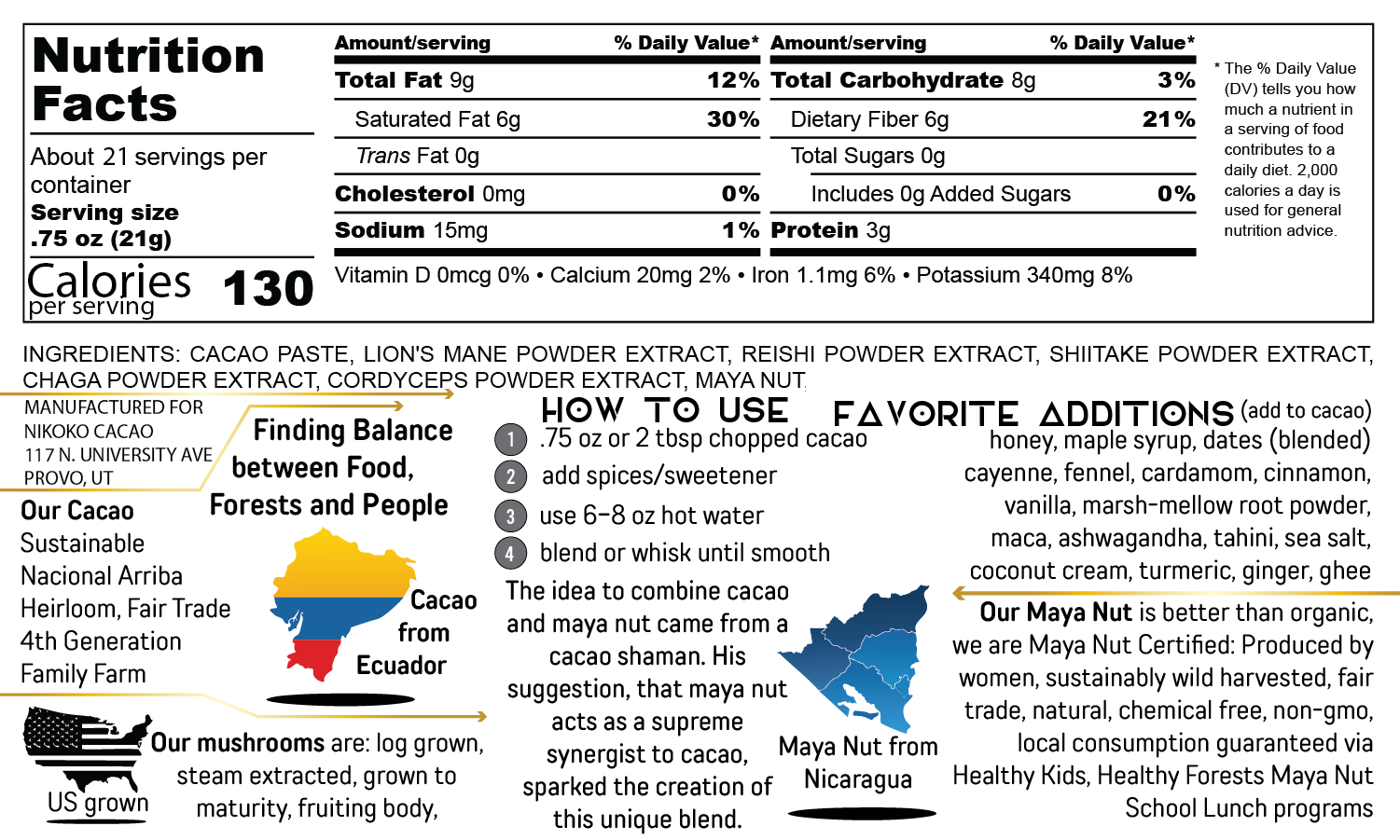 We've taken our signature maya cacao and milled it with the highest quality log grown, fruiting body, functional mushroom blend; reishi, chaga, lions mane, cordyceps and shiitake to create a one-of-a-kind, premium and medicinal cacao. In 1 oz of cacao there is 2.1 grams of mushroom powder or 2100 mg.